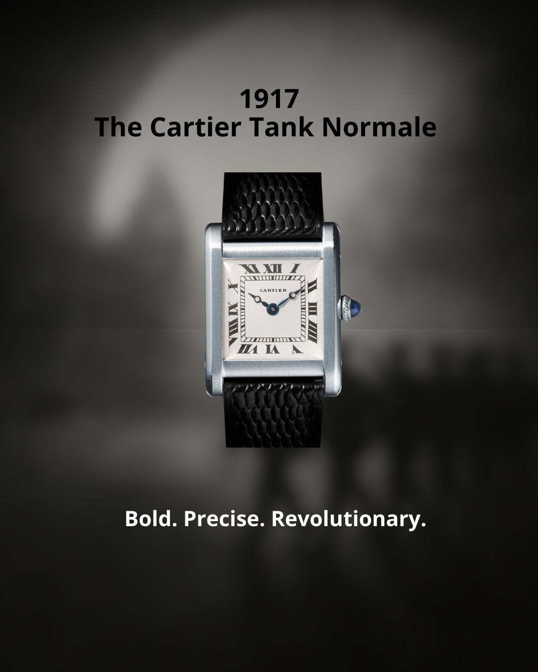 Inspired by the aerial silhouette of the Renault FT tank, Louis Cartier sketched a watch unlike any other. The Tank Normale broke with tradition—rectilinear brancards, a square dial within a rectangle, and the sapphire cabochon crown.