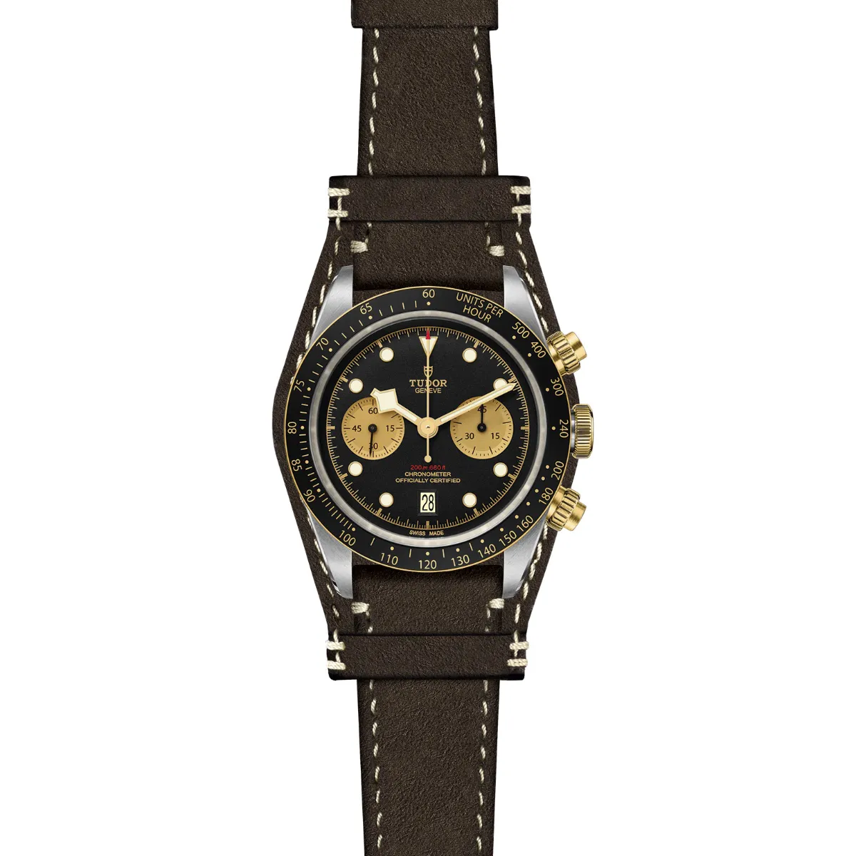 Screw-down winding crown with the TUDOR rose in relief. Solid yellow gold screw-down pushers at 2 and 4 o'clock. Steel covered by a 0.3mm yellow gold cap