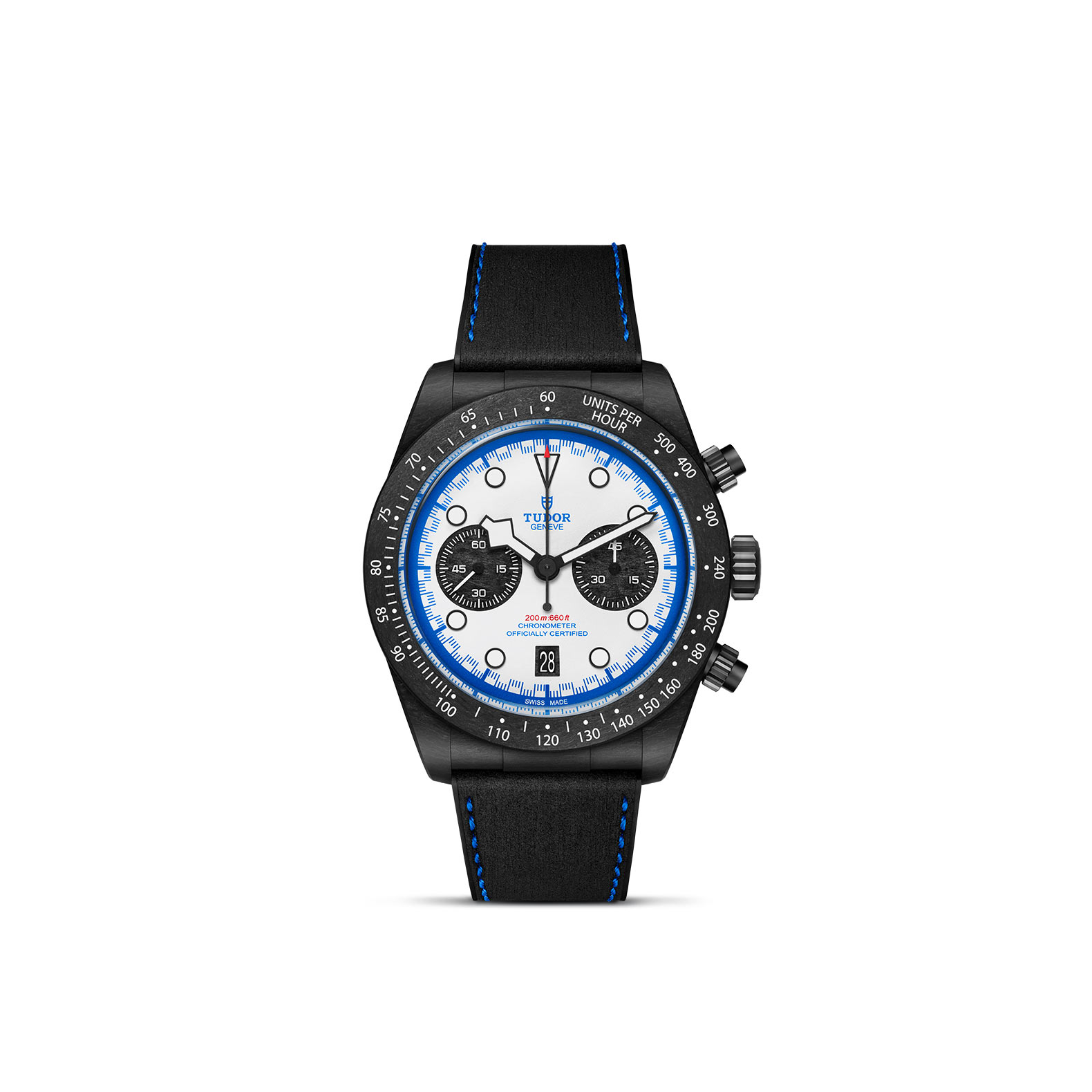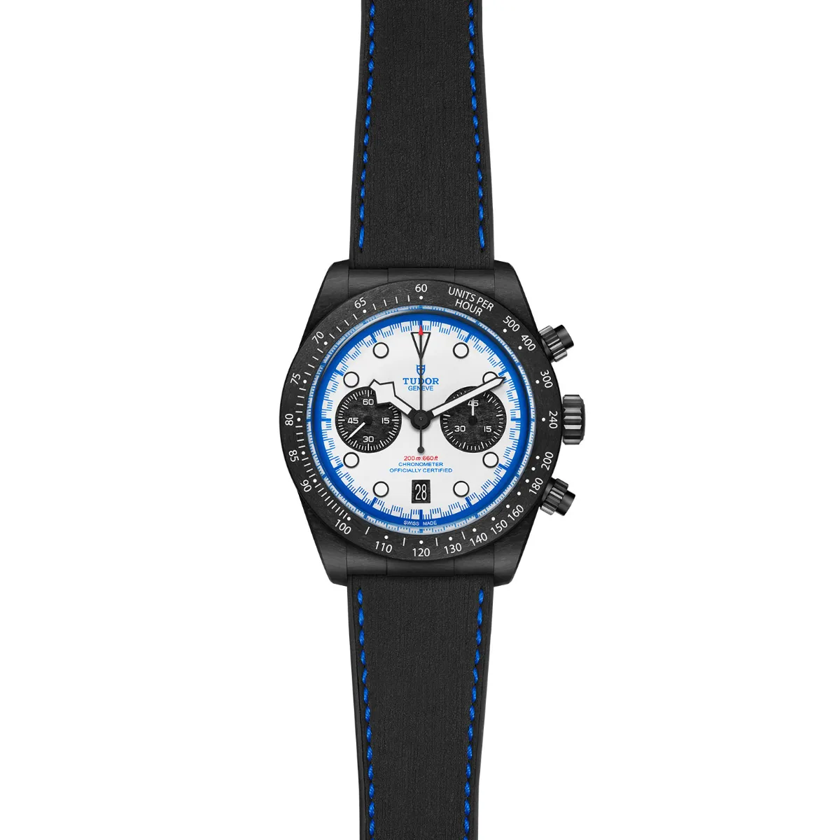 PVD-finished screw-down winding crown with the TUDOR rose in relief. PVD-finished titanium screw-down pushers at 2 o'clock and 4 o'clock