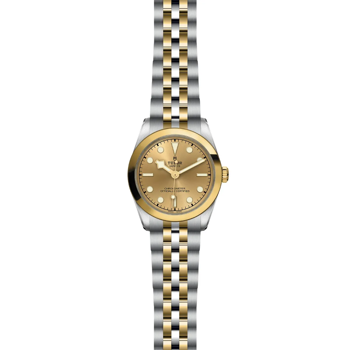 First center links in steel or solid yellow gold. Remaining centre links are made of a steel core capped with 0.2mm of yellow gold. TUDOR "T-fit" folding clasp with safety catch. The logo on the catch is made of solid yellow gold