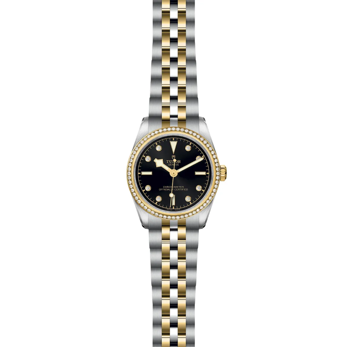 First center links in steel or solid yellow gold. Remaining centre links are made of a steel core capped with 0.2mm of yellow gold. TUDOR "T-fit" folding clasp with safety catch. The logo on the catch is made of solid yellow gold