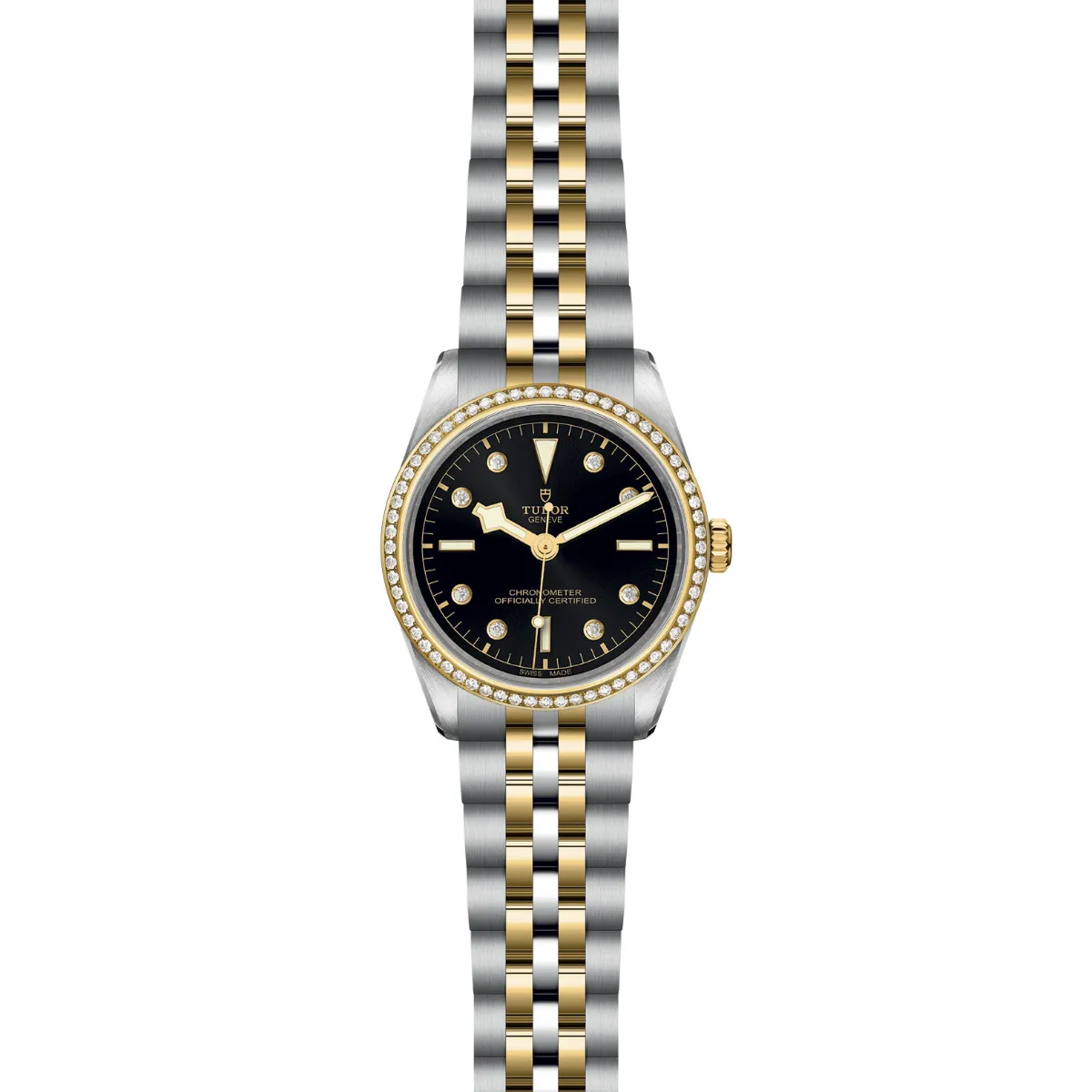 First center links in steel or solid yellow gold. Remaining centre links are made of a steel core capped with 0.2mm of yellow gold. TUDOR "T-fit" folding clasp with safety catch. The logo on the catch is made of solid yellow gold