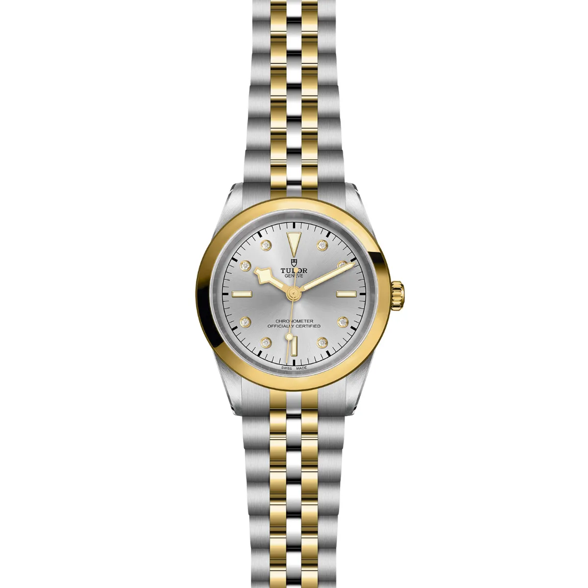 First center links in steel or solid yellow gold. Remaining centre links are made of a steel core capped with 0.2mm of yellow gold. TUDOR "T-fit" folding clasp with safety catch. The logo on the catch is made of solid yellow gold