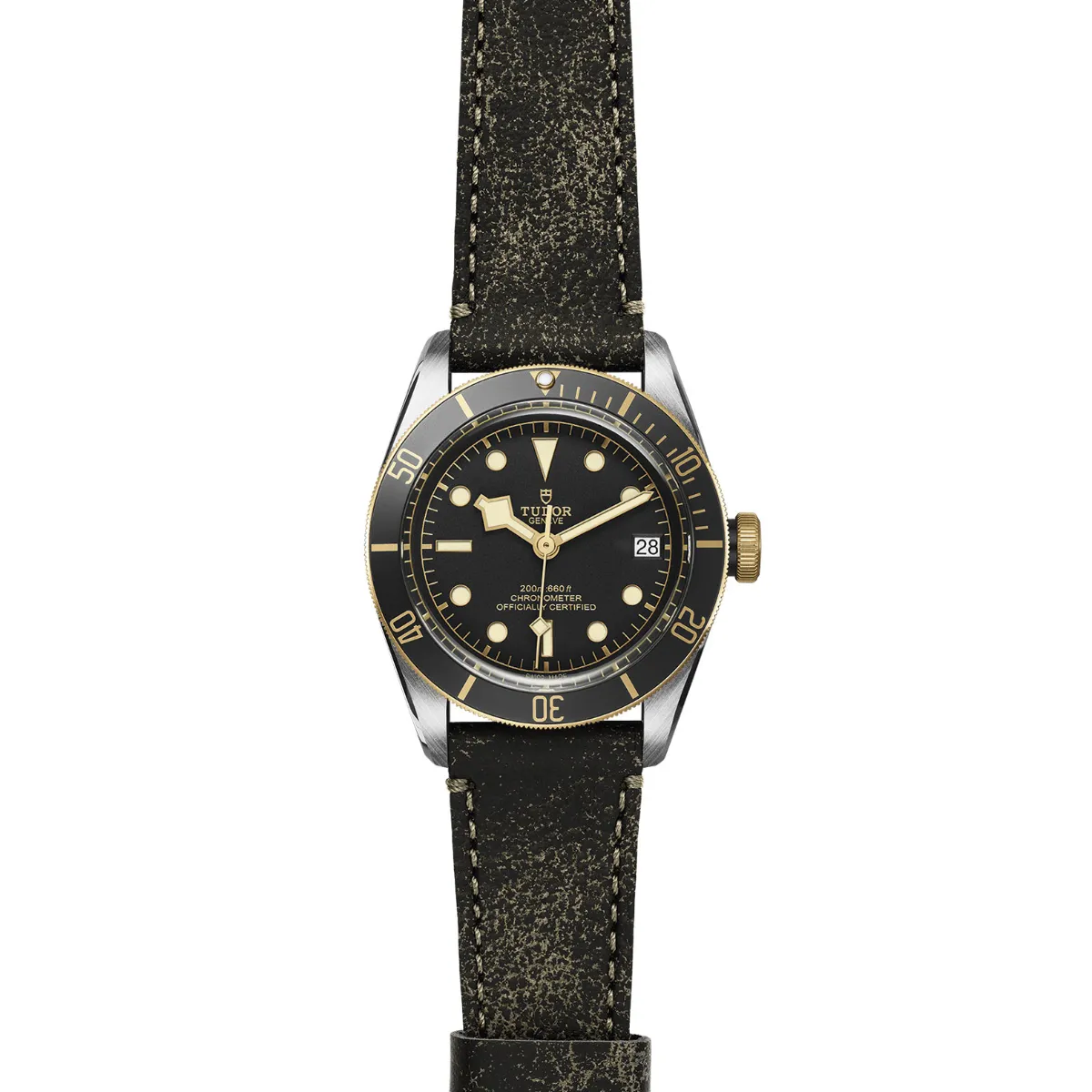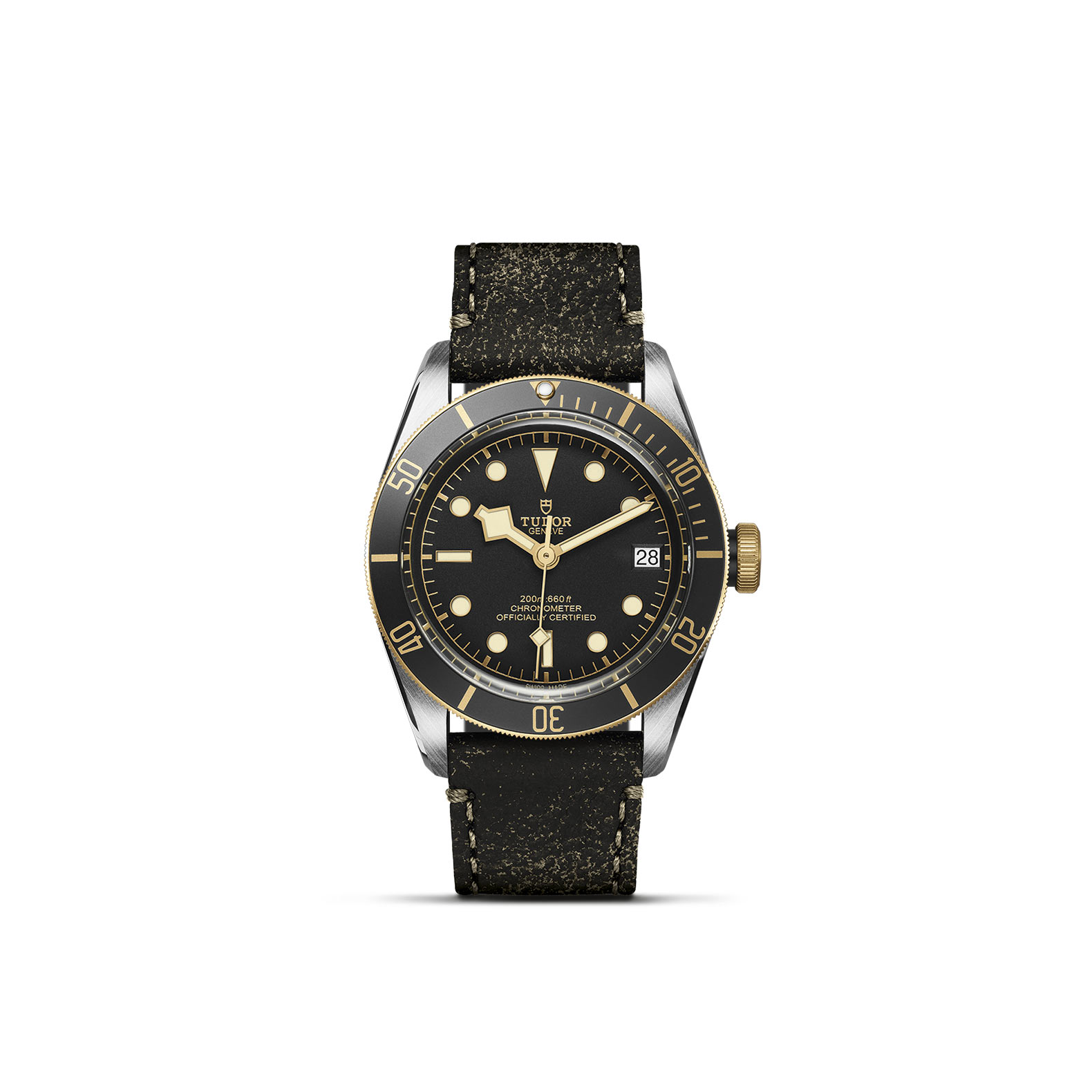 Screw-down winding crown, with the TUDOR rose engraved and lacquered in black, with black anodised aluminium winding crown tube. Steel covered by a 0.3mm yellow gold cap