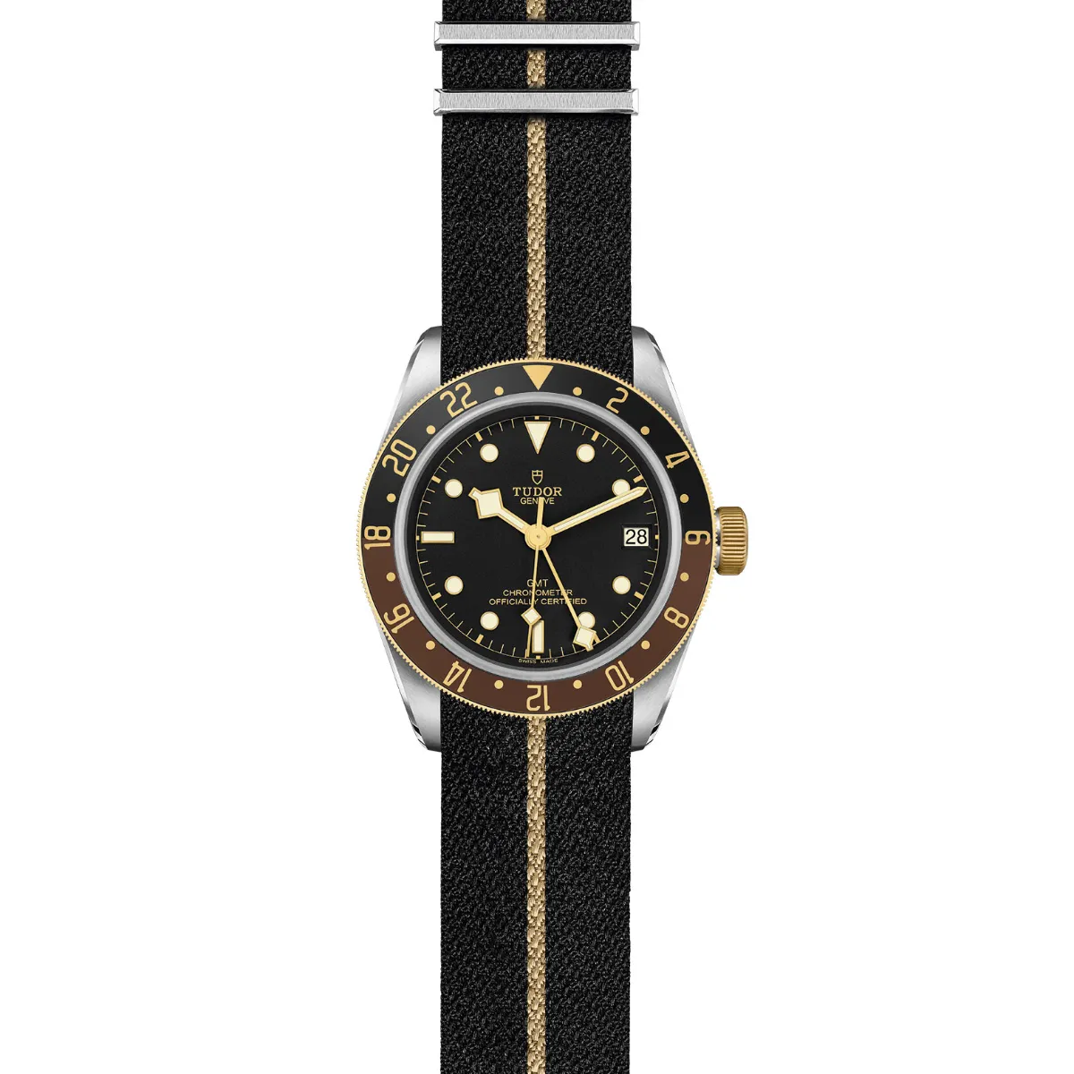 Screw-down winding crown, with the TUDOR rose engraved and lacquered in black, with black anodised aluminium winding crown tube. Steel covered by a 0.3mm yellow gold cap